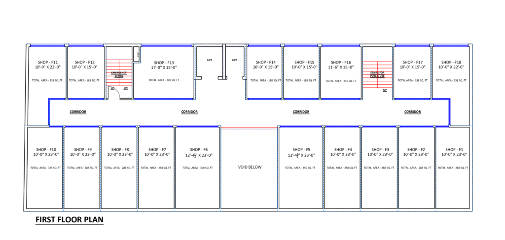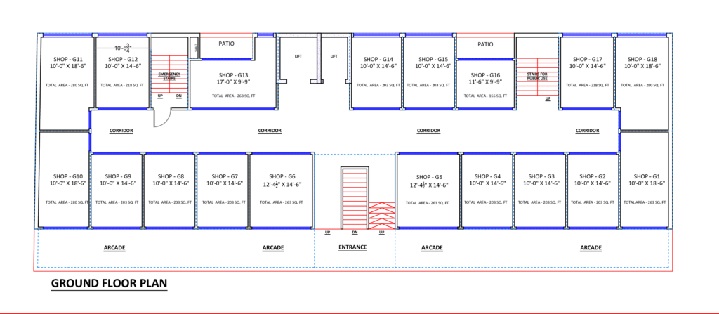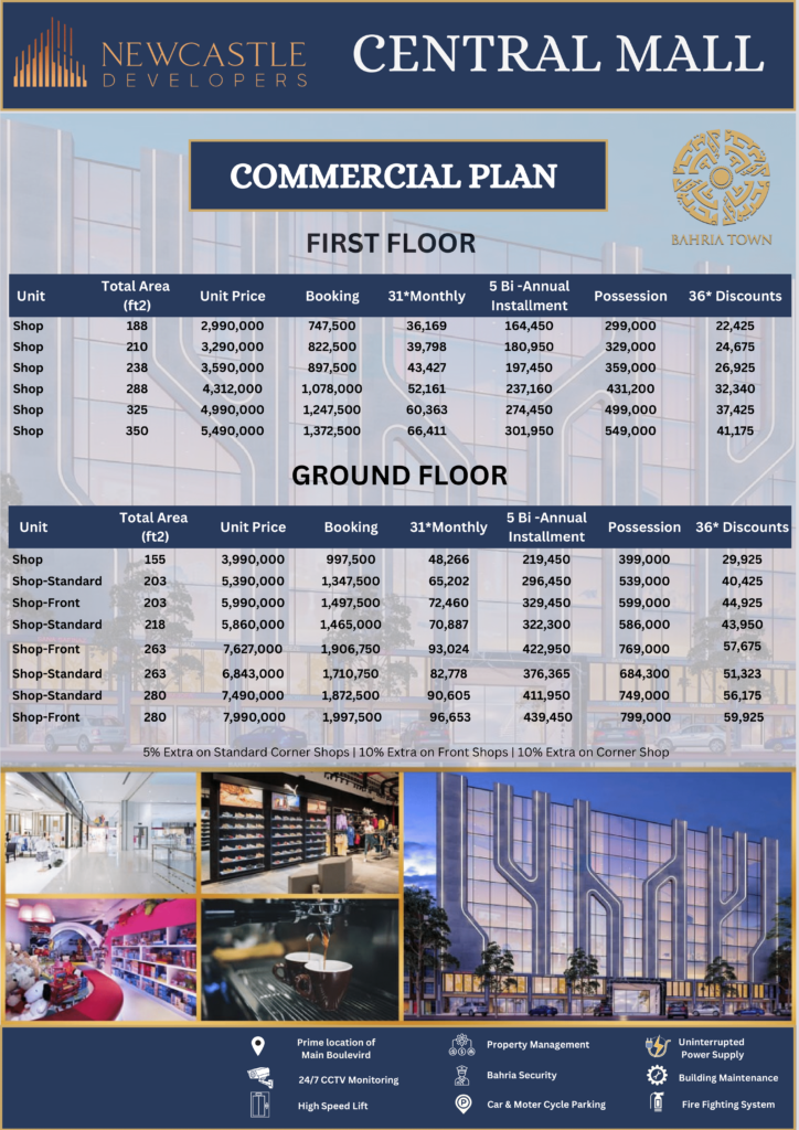 True to its reputation as one of the most opulent residential complexes in Lahore, the Central Mall features three levels of commercial shops situated on the Lower Ground floor, the ground floor, and the 1st floor. Together, these three floors accommodate shops of varying sizes.