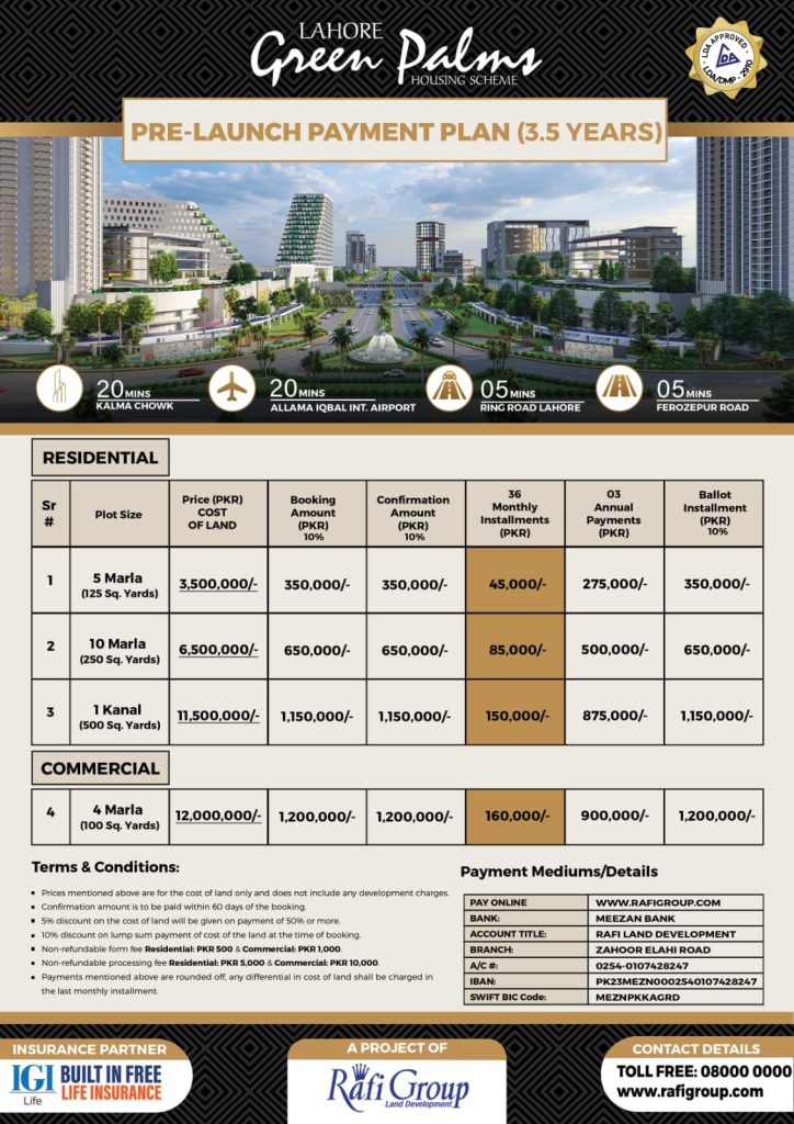 Rafi Group has developed Green Palms Lahore, a residential scheme in Lahore, Pakistan. The project presents various-sized residential plots for purchase, ranging from 5 Marla to 2 Kanal. Its primary goal is to create a sustainable and eco-friendly living space, equipped with contemporary amenities and services to enhance the quality of life for its inhabitants.